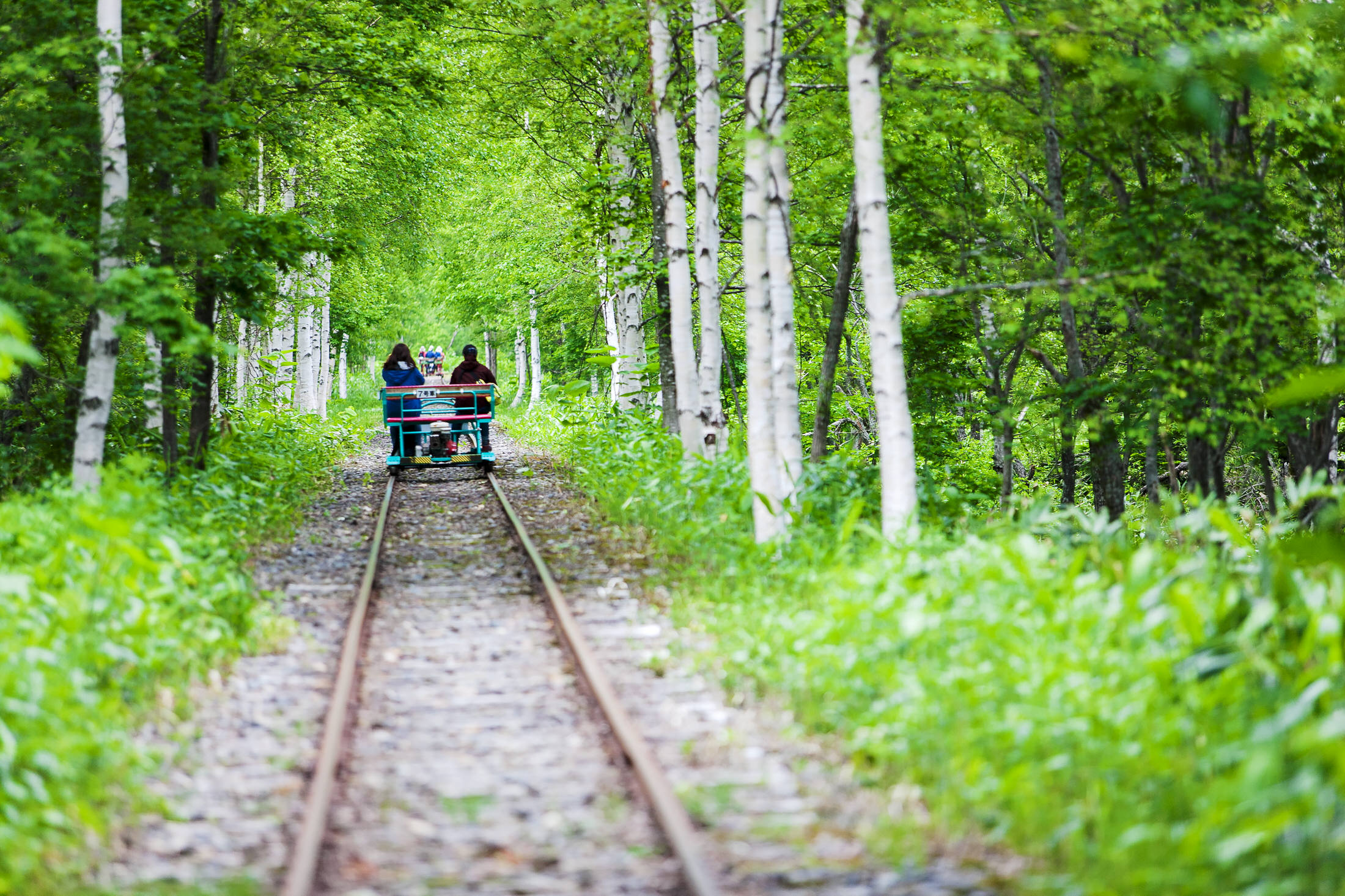 本物のレールの上を白樺や木々のトンネルをくぐり、渓谷の合間や野原を風を切って走るエンジン付のトロッコ。往復10キロ(約40分)自らの運転で走ることができるテーマパークは、全国でもここだけです。