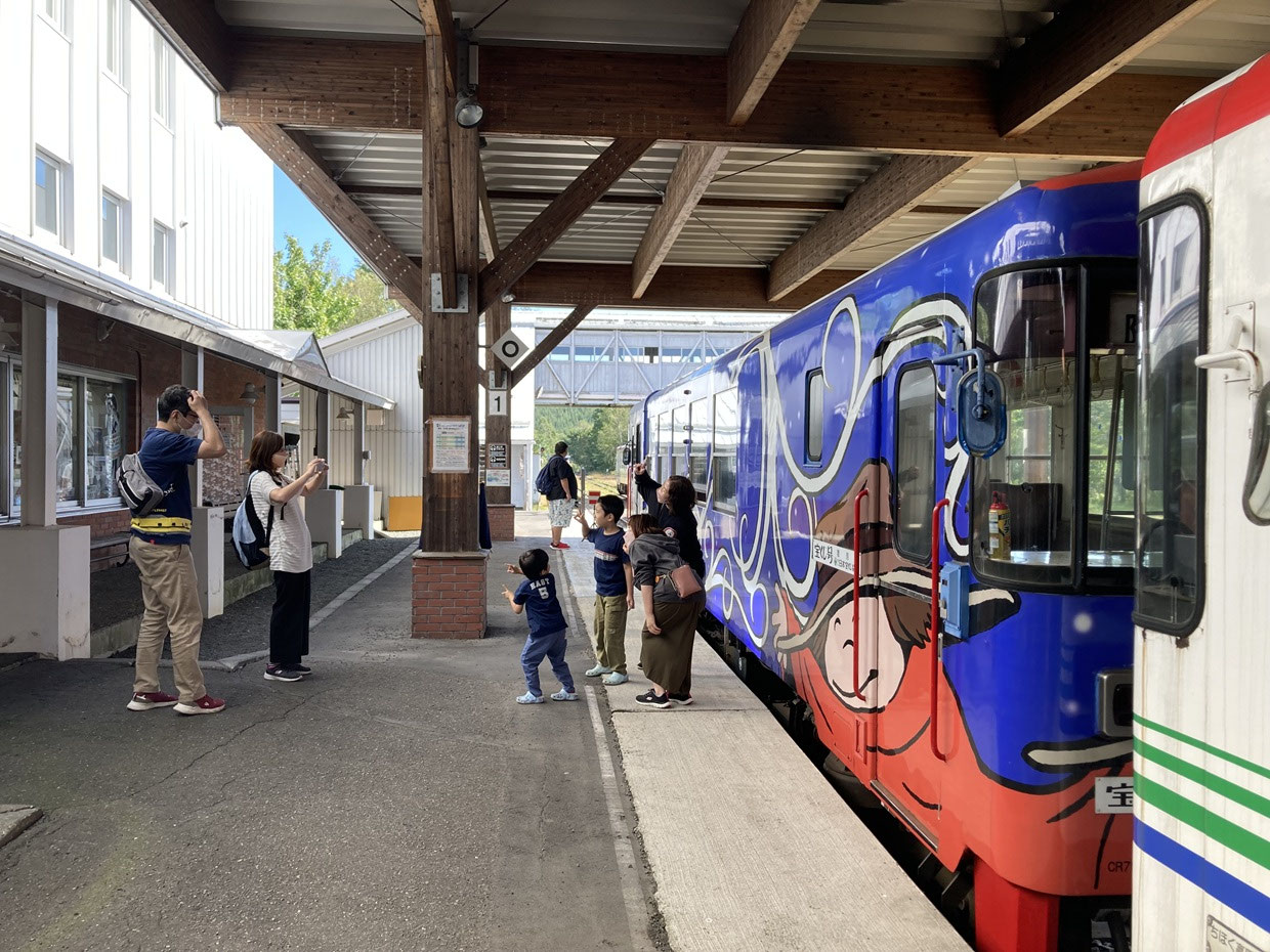 乗り場は木古内町郷土資料館(いかりん館)近く、旧江差線・渡島鶴岡駅の跡地。当時、駅の待合室だった建物が、トロッコ乗車の切符売り場に生まれ変わりました。切符は硬い厚紙で作られた乗車券(硬券)で、昔ながらの改札鋏を入れてもらって乗車します。トロッコは、行きは、スタッフが運転する「動力付軌道自転車」がアシストし、3両編成で乗り場から山側の「キーコの郷」駅まで進みます。そして、帰りは、動力付きアシストの「急行便」1両と、乗り手自身で自転車のようにこいで動かす「快速便(足漕ぎ軌道自転車)」3両とに分かれて、乗り場まで戻ります。