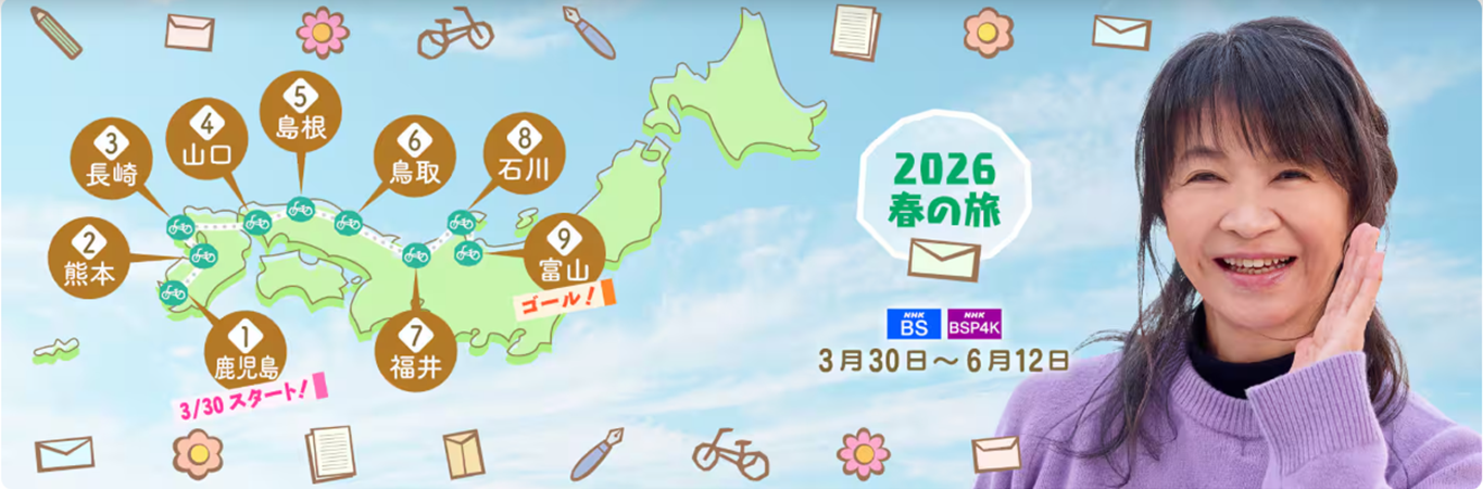 にっぽん縦断 こころ旅 – NHK 2024.01.072026.03.20 2026年の春も、美佐子さんが“こころの風景”を目指して走ります❗❗こころ旅番組HPもNHK ONEの中にあります。NHK ONEへの登録もよろしくお願いいたします🙏 2026春の旅決定の放送が決定しました!2026年春の旅から、BSプレミアム4KとNHK BSが同日放送になります 🌸2026年 春の旅🌸3月30日(月)~6月12日(金)) 今回訪ねるのは、春の鹿児島県をスタートして九州の西側を通り、山口県から日本海側を北上しゴールの富山県を目指します。今回は下記の9県を訪ねます鹿児島県 熊本県 長崎県 山口県 島根県 鳥取県 福井県 石川県 富山県 これまでの旅今までの旅のルートを紹介しています。2011年春の旅から、2019年秋の旅まで レギュラー放送前の「長崎の旅」(2011年2月放送)、「グラバー園から見る稲佐山」「大瀬埼灯台」「新魚目町仲知」「佐世保市針尾島」2011年~2019年の旅までの旅のルートをご覧いただけます。 「こころ旅Instagram」一緒に旅を楽しみましょう♪@nhk_kokorotabi こころ旅番組HPもNHK ONEの中にあります。NHK ONEへの登録もよろしくお願いいたします🙏番組ホームページ日々の旅の情報を紹介していきますので、これまで同様、ぜひHPに遊びに来て下さいね♪ こころ旅ブログ・2011年3月4日~2024年3月29日旅人・火野正平さんと相棒・チャリオの旅のつれづれこころ旅ブログは2024年3月末で終了です。